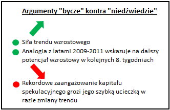 Wygląda wręcz na to, że rosnące pozycje spekulacyjne jeszcze bardziej napędzają zwyżkę, choć warto pamiętać o tym, że w razie załamania trendu wzrostowego mechanizm ten zacznie działać w drugą stronę - ucieczka kapitału będzie napędzała przecenę, co już nie raz obserwowaliśmy.