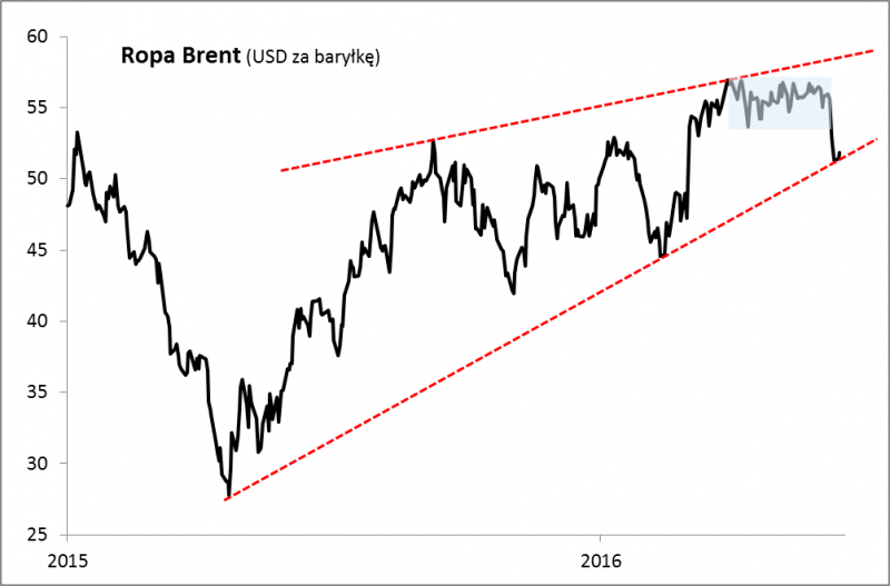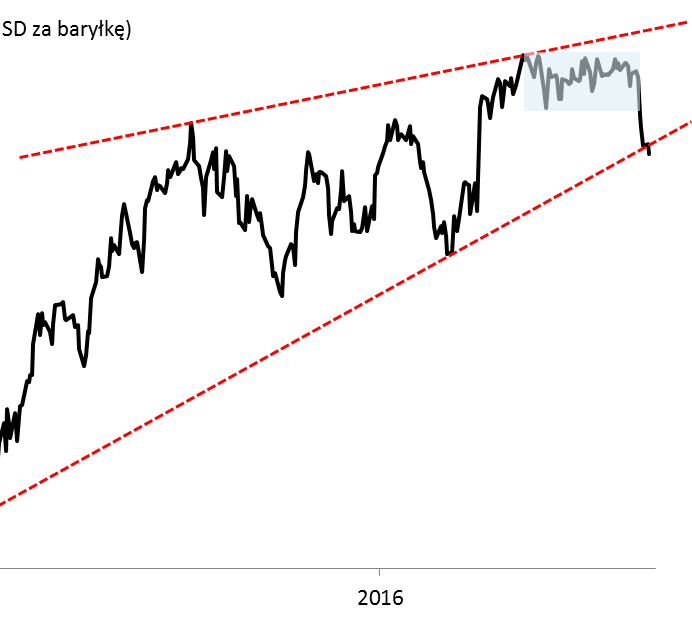 Na razie korektę przeżywają natomiast głównie rynki surowcowe, z ropą naftową na czele. Notowania kontraktów na ropę wybiły się dołem z podobnej krótkoterminowej konsolidacji jak ta na GPW, w efekcie czego dotarły do ważnej linii trendu wzrostowego.