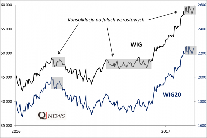 Konsolidacja - czyli ruch w dość wąskim przedziale - sama w sobie nie przesądza jeszcze w jakim kierunku powinno nastąpić "wybicie", choć wcześniejsze wysokie poziomy wskaźników nastrojów, o których kilkakrotnie pisaliśmy, przemawiałyby raczej za scenariuszem korekty ostatnich zwyżek.