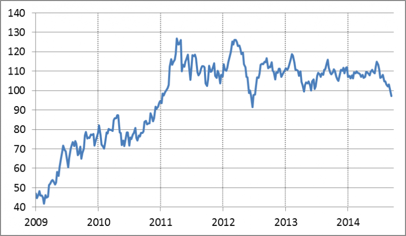 Co prawda ostatni spadek ceny ropy wyrażonej w dolarach to po części skutek umocnienia tej waluty, ale nawet po przeliczeniu np. na euro okazuje się, że cena surowca od prawie czterech lat stoi w miejscu.