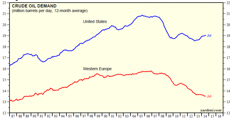 Rys. 2. Popyt na ropę naftową w USA i Europie Zachodniej