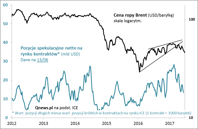 W lutym alarmowaliśmy, że pozycje spekulacyjne osiągnęły rekordowe rozmiary w atmosferze powszechnej wiary w "Trumpflation" (wzrost inflacji pobudzony przez pakiety stymulacyjne obiecane przez nowego prezydenta USA). Alarm był trafny, bo od tego czasu ceny ropy się korygują. Teraz czekamy na odwrotny sygnał. Na razie jednak pozycje spekulacyjne są ciągle dość okazałe (uwaga na opóźnienie w danych - dotyczą stanu na 13 czerwca). Dopiero ich spadek do niskich poziomów skłoniłby do zastanowienia nad tym czy ropa osiąga lokalny dołek.