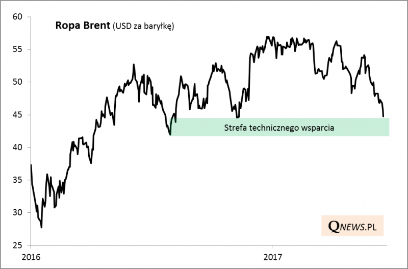Tania ropa to z pewnością świetna informacja dla gospodarki światowej jako całości ze względu na brak presji inflacyjnej, która mogłaby zmusić banki centralne do gwałtownego zaostrzania polityki monetarnej. Gdyby jednak spadek wymknął się spod kontroli i zbliżył ceny do poziomów z początku 2016, byłby to w średnim terminie czynnik ryzyka. Choćby ze względu na potencjalne kłopoty amerykańskiego sektora naftowego, który sporo waży w głównych indeksach. Niemniej na razie notowania zbliżyły się do technicznej strefy wsparcia, która potencjalnie mogłaby wyhamować przecenę.