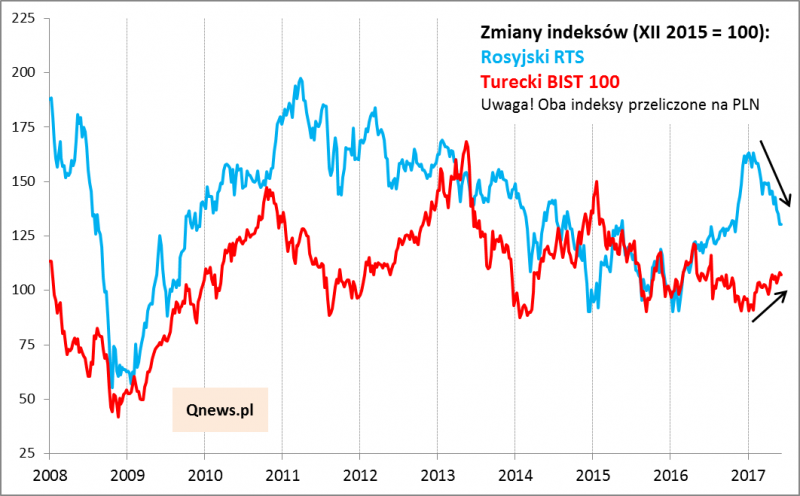 Abstrahując już od tych "taktycznych", średnioterminowych rozważań trzeba niestety przyznać, że na dłuższą metę oba rynki rozczarowują brakiem długoterminowego trendu wzrostowego, jaki znamy choćby z rynków rozwiniętych. Rosyjskie aktywa uzależnione są głównie od chwiejnej ceny ropy naftowej, zaś tureckie na "papierze" wyglądają bardzo dobrze...
