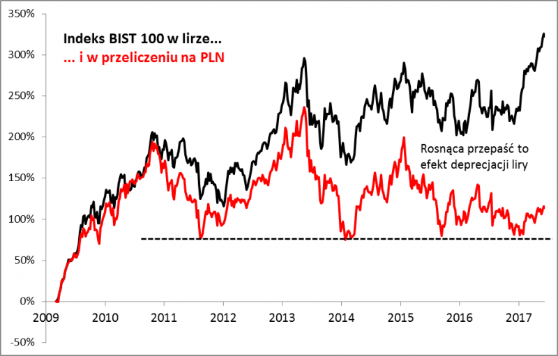 ... ale tylko nominalnie, bo na przestrzeni lat większość zysków inwestorów zagranicznych (w tym polskich) pożera postępująca deprecjacja liry (to z kolei efekt tego, że będący pod presją polityczną bank centralny nie potrafi zdobyć się na definitywne stłumienie inflacji podkopującej wartość waluty).
