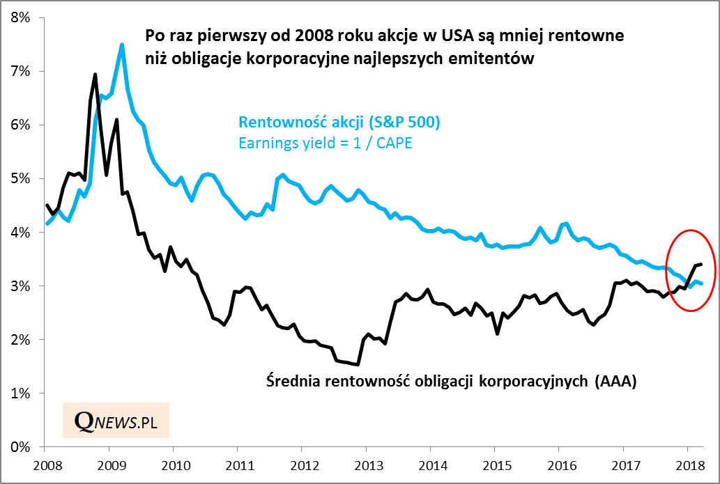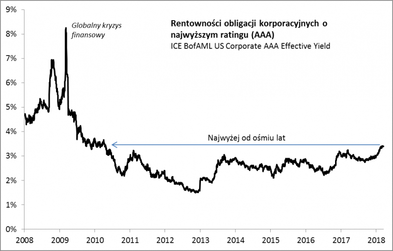 Postępujący wzrost rentowności obligacji - nie tylko skarbowych, ale też korporacyjnych - jest jednym z czynników, które odróżniają obecną zawieruchę na Wall Street od wielu innych korekt od czasu globalnego kryzysu finansowego. Niedawno karierę wśród internetowych komentatorów robił wykres pokazujący, że rentowności bonów skarbowych w USA urosły powyżej stopy dywidendy dla S&P 500 (wynosi zaledwie ok. 1,8 proc.). Jakkolwiek nie traktujemy tego porównania jako wiarygodnego wyznacznika, to jednak trzeba przyznać, że amerykańskie akcje stają się coraz mniej atrakcyjne względem papierów dłużnych także na bazie innych kryteriów. Bezpośrednią konkurencją dla akcji są obligacje korporacyjne. Tymczasem rentowności nawet papierów emitowanych przez spółki o najwyższym ratingu kredytowym (AAA) urosły do ok. 3,4 proc., najwyżej od ... ośmiu lat.