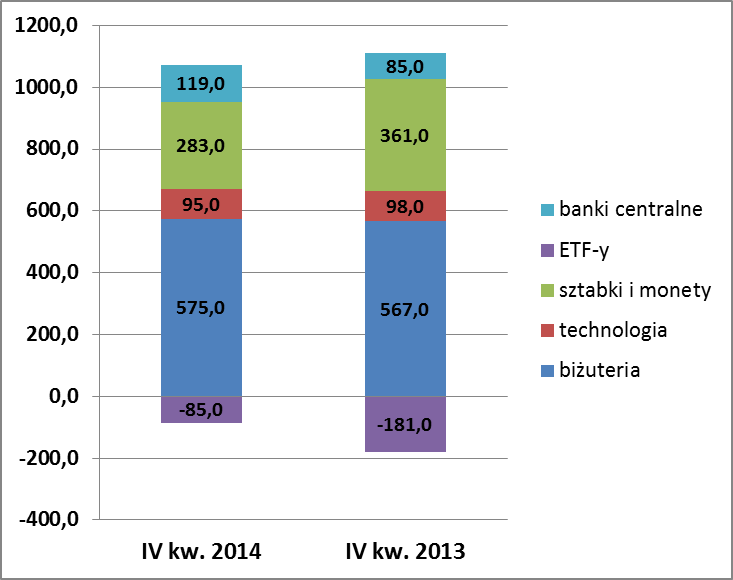Odpowiedź: spadek popytu inwestycyjnego na sztabki i monety. Rekordy osiągnął on w 2013 r. (kiedy niższe ceny zachęcały nabywców) i od tej pory stopniowo maleje. Tu jednym z "winowajców" są Chiny. Być może przyczyną jest słabnący (choć nadal relatywnie szybki) wzrost gospodarczy. WGC wskazuje też na walkę władz z łapówkarstwem, co mogło ograniczyć popyt na małe sztabki powszechnie wykorzystywane w tym procederze.
