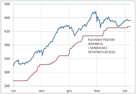 W obecnej sytuacji można tylko żałować, że sytuacja na GPW nie jest kopią tej z Wall Street, gdzie indeks S&P500 regularnie ustanawia nowe historyczne rekordy. U nas techniczny obraz rynku jest mniej jednoznaczny. Wraz z upływem czasu coraz trudniej uzasadnić tezę, że obliczany przez nas indeks nieważony (jego zaletą są stabilne trendy) jest ciągle w tendencji wzrostowej. Owszem, na plus należy zapisać to, że pozostaje on powyżej poziomów wsparcia, ale z drugiej strony tkwi tam, gdzie był jeszcze w lutym. Trend wzrostowy przerodził się tu ewidentnie w trend boczny.