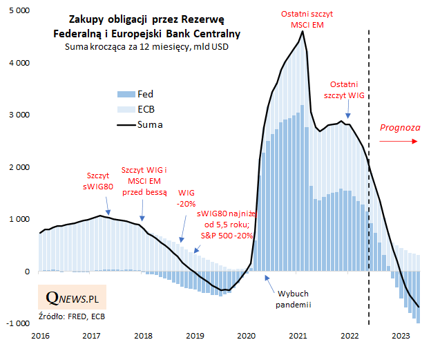Już samo wcześniejsze wyłączenie QE przez Fed przyczyniło się do tegorocznych turbulencji na Wall Street i innych rynkach akcji. Można więc podejrzewać, że wejście w kolejny etap jastrzębiej polityki, może utrzymywać presję na rynki. Tak też było w trakcie wspomnianego poprzedniego przykręcania kurka z pieniędzmi w latach 2017-19 (a przecież tamta opadająca linia wygląda płasko w porównaniu z obecną trajektorią).