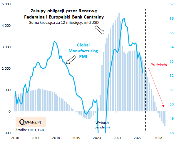 Nasze dociekania na temat znaczenia wahań globalnej płynności finansowej prowadzą też do obserwacji, że są one intrygująco skorelowane z wahaniami globalnej koniunktury gospodarczej (obrazowanej na poniższym wykresie przykładowo przez wskaźnik PMI). Wygląda na to, że obecne przykręcanie kurka z pieniędzmi przez banki centralne ma silny wpływ na opisywane w innych naszych analizach spowolnienie gospodarcze. I chyba na tym jeszcze niestety nie koniec...