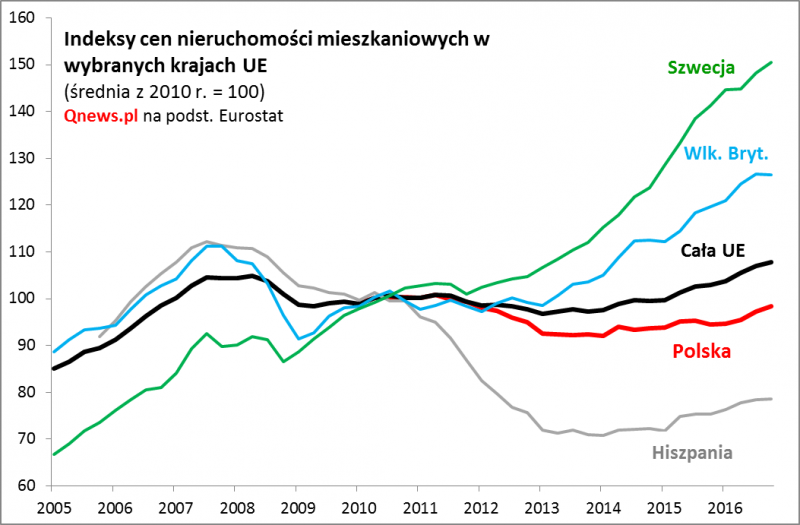Uwaga - dla Polski brak jest niestety danych dla okresu sprzed 2010, więc trudno stwierdzić jaki dystans dzieli ceny od szczytu z 2007 r.