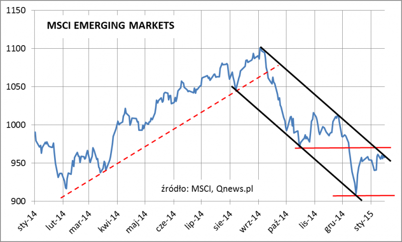Przeglądając sytuację na światowych giełdach, można zauważyć próbę poprawy koniunktury na rynkach wschodzących. Przypomnijmy, że miniony rok przyniósł typową także dla poprzednich lat huśtawkę nastrojów – o ile pierwszą połowę roku indeks MSCI Emerging Markets spędził (ku zaskoczeniu wielu) na systematycznej wspinaczce, to od września (znów ku dość powszechnemu zaskoczeniu) rozpoczął równie uporczywy zjazd. Teraz jednak pojawia się dla odmiany znów szansa na zmianę kierunku ruchu. Indeks MSCI dotarł do górnej linii kanału spadkowego, w jakim jest od jesieni ub.r. Jej pokonanie z punktu widzenia analizy technicznej byłoby obiecującym sygnałem.
