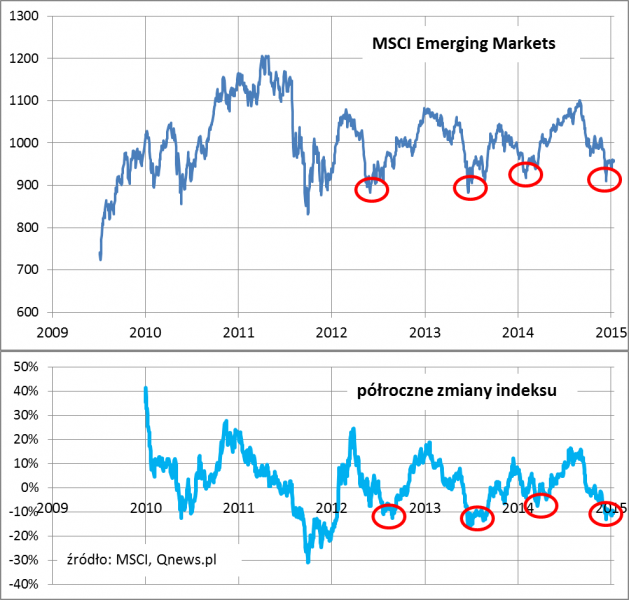Warto też zwrócić uwagę, że ewentualna fala poprawy nastrojów dobrze wpisywałaby się w cykl, jaki „rządzi” rynkami wschodzącymi już od ponad trzech lat. Schemat tego cyklu jest prosty – kiedy indeks MSCI był kilkanaście procent na minusie w horyzoncie półrocznym, był to zwykle dołek cyklu. Teraz ten warunek znów jest spełniony, co by sugerowało zwrot w górę. Warto wspomnieć, że na szczytach cyklu półroczna zmiana indeksu sięgała od +10% do +25%.