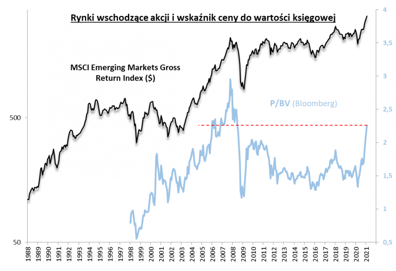 Warto zauważyć jak gwałtowną przemianę przeżyły emerging markets w ciągu ostatnich dziesięciu miesięcy. Jeszcze w marcu ub.r. pod wpływem globalnego krachu wskaźnik P/BV zszedł wtedy do poziomu bliskiego wieloletnim minimom. Wtedy można było mówić o rynkach wschodzących, że są bardzo tanie. A teraz? Taka diagnoza byłaby już bez wątpienia nieuzasadniona.