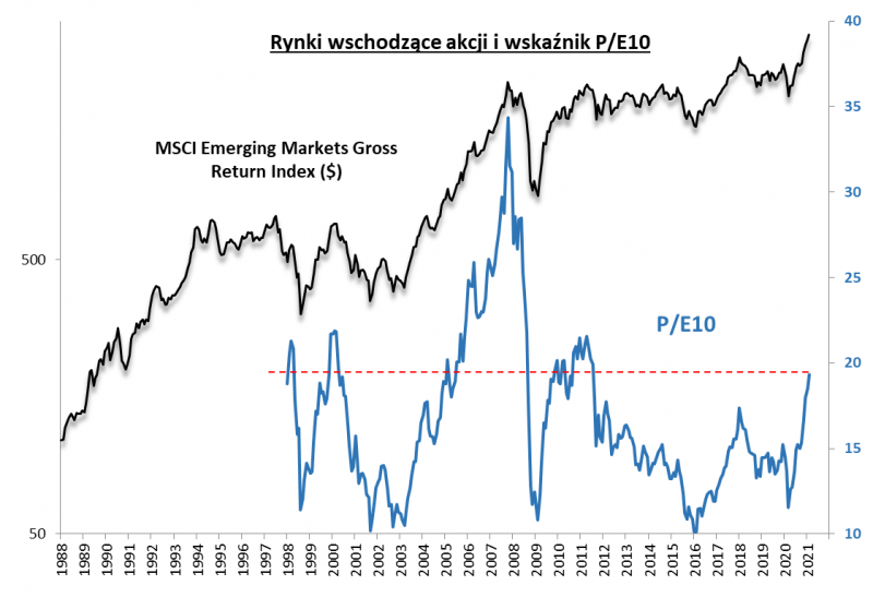 Wspólny mianownik jest taki, że w trakcie korona-krachu było bardzo tanio, a teraz o niskich wycenach nie sposób już mówić. P/E10 jest jednak bardziej optymistyczny jeśli chodzi o to jak drogo jest obecnie. Rynki wschodzące wg tego kryterium nie są jeszcze tak „bogato” wyceniane jak na szczytach hossy w latach 2011, 2000 lub 1997, nie mówiąc już o kosmicznych poziomach z jesieni 2007.