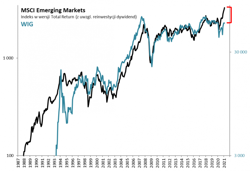 Reasumując, rynki wschodzące jak na razie realizują pokładane w nich konsensusowe nadzieje i mają za sobą bardzo udany początek roku. Ceną za to są wyraźnie wyższe wyceny. Jeśli w trakcie korona-krachu w marcu ub.r. ekstremalnie niskie wskaźniki typu P/BV i P/E10 uzasadniały postawę „kupuj”, to teraz jest to raczej „trzymaj”. Ale jeszcze niekoniecznie „sprzedaj”, bo wyceny nie doszły do ekstremalnie wysokich pułapów. W cieniu tych globalnych trendów rozgrywa się sytuacja na GPW. Widzimy poważne zaległości WIG-u względem emerging markets.