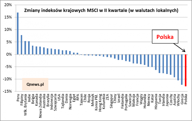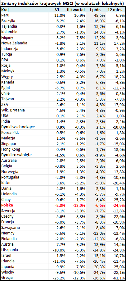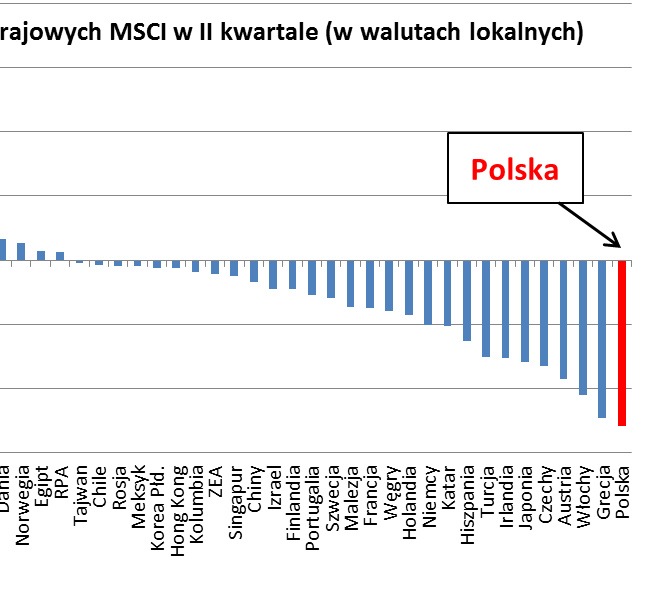 Niestety inwestorzy na GPW niezbyt jak na razie skorzystali z tych dobrodziejstw. Chociaż historycznie WIG20 zmieniał się w rytmie innych emerging markets, to ostatnio został daleko w tyle. I to bez względu na to czy popatrzymy na sam czerwiec, całe I półrocze czy też ostatnie 12 miesięcy. W każdym przypadku indeks MSCI Poland (obejmuje 39 dużych spółek z GPW) uplasował się w dolnej części tabeli. Zdecydowanie najgorszej wypadł w samym II kwartale - ze zmianą na poziomie -13% okazał się gorszy nawet niż dość egzotyczna już Grecja.