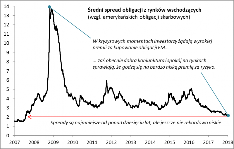 Póki co obserwujemy też dalszy wzrost apetytu na ryzyko także w innej płaszczyźnie. Dobrym barometrem tego apetytu w przypadku emerging markets są tzw. spready obligacji (im mniejszy spread, czyli różnica rentowności, tym mniejszej "premii" za posiadanie obligacji z rynków wschodzących względem uznawanych za bezpieczne papierów amerykańskich żądają inwestorzy). W ostatnich dniach spready spadły do nowych wieloletnich minimów. Są o krok od spadku poniżej progu 2 pkt. proc. Poprzednio tak niskie były jeszcze ... dziesięć lat temu. Ale bywały też jeszcze niższe - w okresie wielkiej hossy na emerging markets z lat 2004-2007.