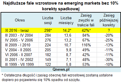 Wejście indeksu rynków wschodzących na nowe szczyty wywołało przy okazji ciekawy efekt statystyczny. Według naszych obliczeń jeszcze nigdy w historii nie mieliśmy do czynienia z tak długą falą nieprzerwanych zwyżek na emerging markets. Wzrosty bez co najmniej 10% korekty trwają tam już od ponad 14. miesięcy. Pobity został poprzedni rekord z lat 2003-2004.