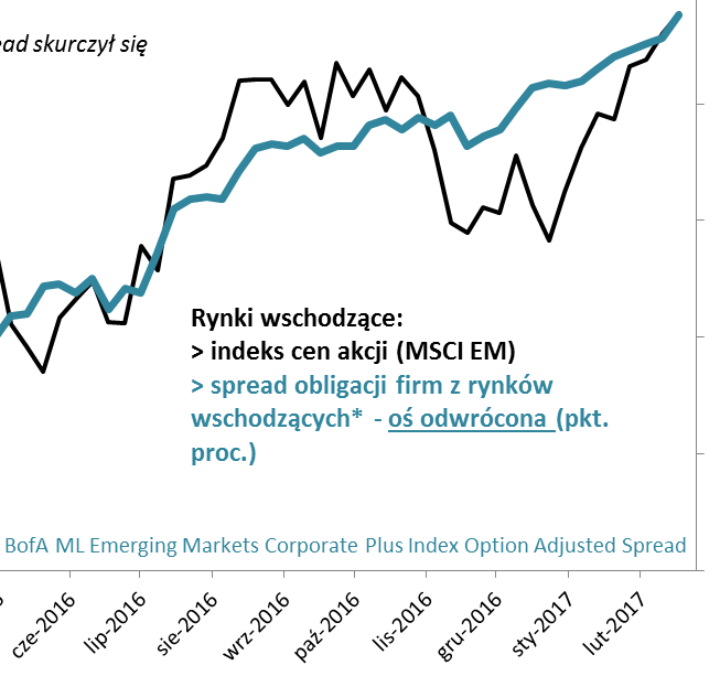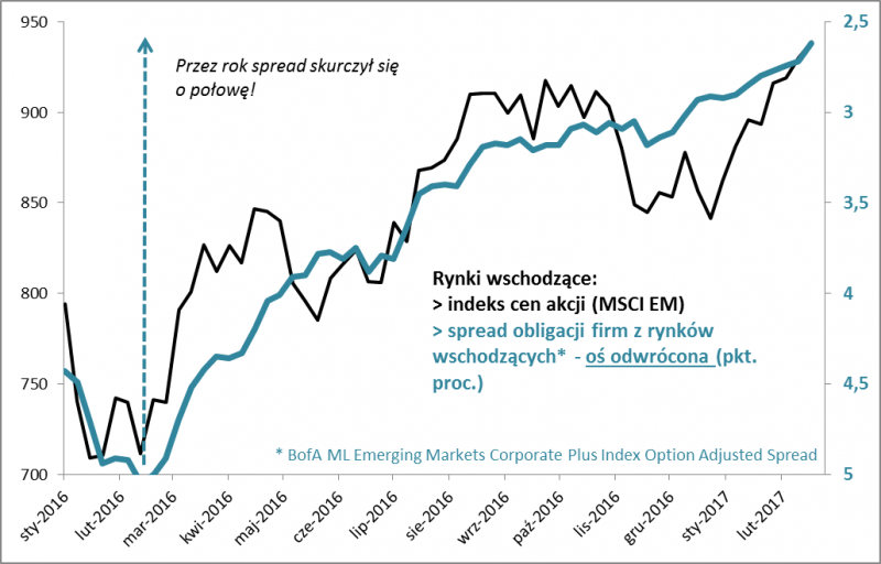 Ale co z samymi rynkami wschodzącymi? Dlaczego przez rok urosły o 30% i z poziomów ponad sześcioletnich (!) minimów wspięły się na pułapy najwyższe od półtora roku? Nasze poszukiwania zaprowadziły nas w kierunku kolejnego ważnego elementu układanki. Okazuje się, że dobrym barometrem nastrojów inwestorów względem emerging markets jest wskaźnik relatywnej atrakcyjności ... obligacji tamtejszych firm. Można przyjąć, że im niższa jest ta atrakcyjność (mierzona tzw. spreadem - różnicą rentowności względem bezpiecznych amerykańskich papierów skarbowych), tym lepsze humory inwestorów. A im wyższy spread, tym inwestorzy żądają więcej za kupowanie ryzykownych papierów i tym samym gorsze ich nastawienie względem emerging markets.
