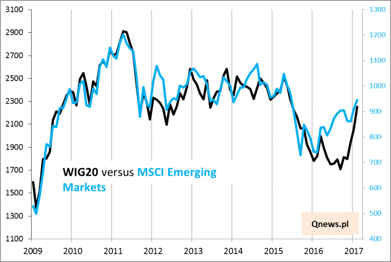 Sytuacja na rynkach wschodzących zajmuje centralną pozycję w naszych analizach, choćby ze względu na historyczną korelację łączącą emerging markets z rodzimym WIG20. Wskazywaliśmy już, że polski indeks nadrobił ubiegłoroczne zaległości względem MSCI Emerging Markets, więc teraz powinien już zachowywać się mniej więcej tak jak ten globalny benchmark.