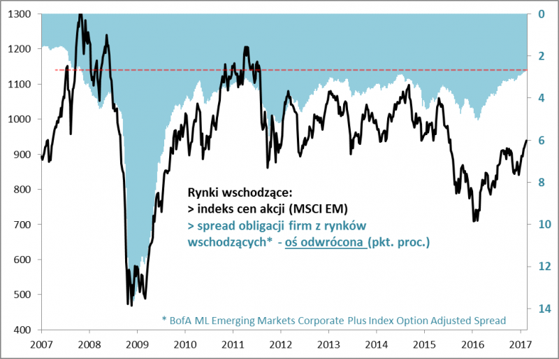 To porównanie jest o tyle użyteczne, że spread - jako barometr nastrojów - nie może kurczyć się w nieskończoność. Już teraz jest na poziomach najniższych od ... września 2007 roku, czyli od czasu, gdy globalne rynki akcji zaczynały pogrążać się w bessie. Czy może skurczyć się jeszcze bardziej? Owszem. W szczycie euforii na rynkach wschodzących z połowy 2007 spread wynosił zaledwie ok. 1,6 pkt. proc. Trzeba jednak pamiętać, że to były poziomy świadczące o bańce spekulacyjnej.