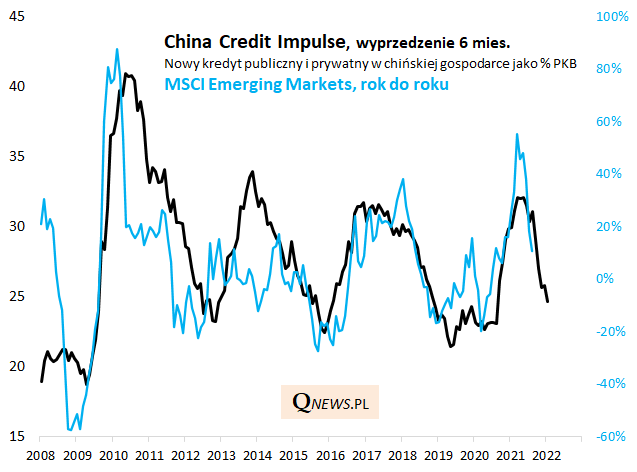 Już wcześniej zwracaliśmy uwagę, że powtarzający się regularnie cykl chińskiego impulsu ma zauważalne przełożenie na cykl np. właśnie na rynkach wschodzących (i to z wyraźnym wyprzedzeniem, wynoszącym ok. pół roku). I ta prawidłowość zdaje się ciągle sprawdzać. Jeśli jej wierzyć, 12-miesięczna dynamika MSCI EM na przełomie roku powinna znaleźć się wyraźnie poniżej zera.