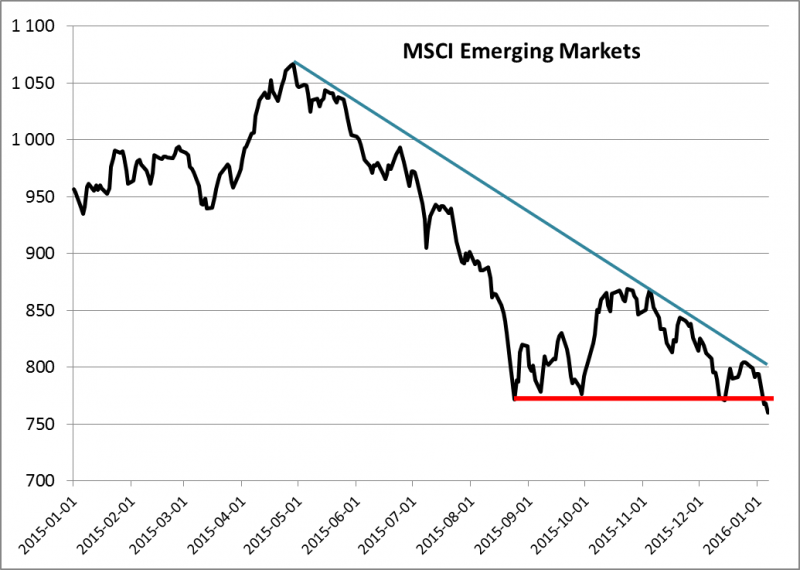 Po tradycyjnym noworocznym optymizmie ani śladu na światowych rynkach akcji. Obawy przed spowolnieniem gospodarczym, szczególnie w Chinach, zepchnęły indeks MSCI Emerging Markets (23 rynki wschodzące, w tym Polska) poniżej technicznego poziomu wsparcia, jakie stanowiła seria dołków począwszy od sierpniowej paniki. Z technicznego punktu widzenia mamy więc potwierdzenie trendu spadkowego.