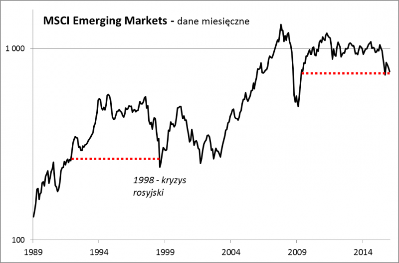 Jak widać we współczesnej historii emerging markets (po upadku komunizmu) z taką sytuacją inwestorzy mieli do czynienia tylko raz - pod koniec 1998 roku, po dwóch wstrząsach: kryzysie azjatyckim (1997) oraz bankructwie Rosji Jelcyna i upadku funduszu hedgingowego LTCM (1998). Gdyby tamten scenariusz miał się powtórzyć, to obecne spadki byłyby już ostatnią fazą bessy na rynkach wschodzących. Tylko czy na podstawie jednego historycznego przypadku można budować wiarygodne scenariusze?