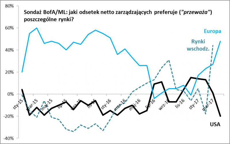 Najnowszy globalny sondaż Bank of America/Merrill Lynch wśród zarządzających pokazuje radykalne przetasowania w portfelach funduszy. Z deklaracji menedżerów wynika, że doszło do ucieczki kapitałów z amerykańskiego rynku, postrzeganego jako bardzo drogi (z tym się zgadzamy - o wysokich wycenach w USA piszemy od dawna). BofA/ML podaje, że tzw. alokacja osiągnęła tam poziomy najniższe od czasów kryzysu finansowego w 2008 roku! Ale pieniądze wycofywane z Wall Street trafiły najwyraźniej na inne rynki. Jednocześnie bowiem gwałtownie podskoczyło deklarowane przez menedżerów funduszy zaangażowanie w europejskich akcjach oraz na rynkach wschodzących, które uznawane są za relatywnie tanie (i z tym się zgadzamy).
