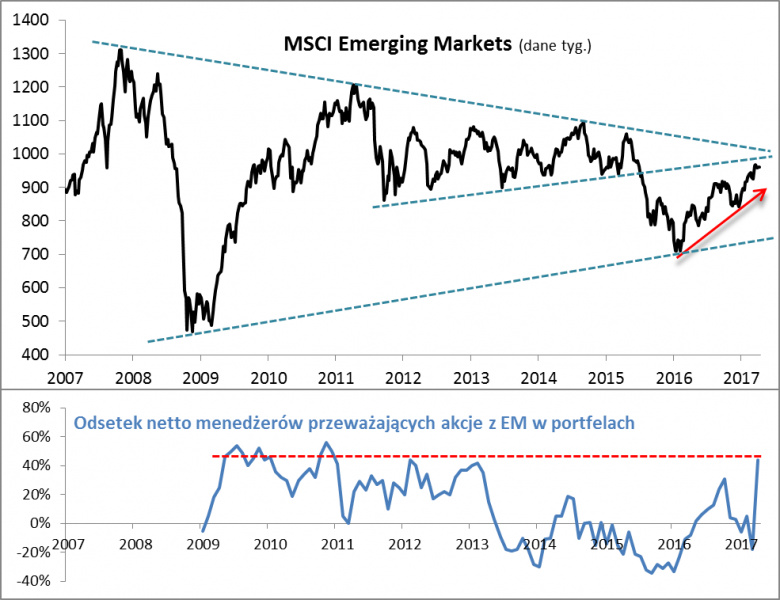 Jeśli już coś martwi, to fakt, że po kwietniowym wystrzale barometr nastawienia zarządzających względem emerging markets jest już na poziomach należących do najwyższych w historii. Bliższe przyjrzenie się sprawie nie pozwala jednak wysnuć jednoznacznych wniosków. Z jednej strony po takich odczytach optymizmu w latach 2012-2013 dochodziło do załamania fal zwyżkowych, ale z drugiej w okresie silnej hossy (2009-2010) wysoki optymizm nie przeszkadzał we wspinaczce na nowe maksima. Bardziej istotny może być fakt, że indeks EM zbliża się do mocnych technicznych poziomów oporu. Konfrontacja z linią łączącą trzy ważne szczyty począwszy od 2007 roku mogłaby się okazać bolesna. Pocieszające jest, że brakuje do niej jeszcze niemal 10%.