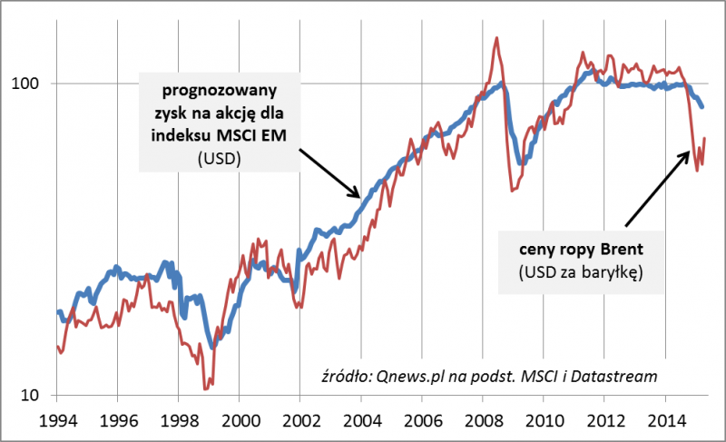 Z naszej analizy wynika, że historycznie zmiany zysków na EM były ściśle skorelowane ze zmianami cen ropy naftowej, jako głównego reprezentanta rynków surowcowych (rynki wschodzące są często albo znaczącymi eksporterami surowców – jak Rosja, albo w dużym stopniu decydują o popycie na nie – jak Chiny). Jeśli bessa na rynku ropy dobiegła końca (kwiecień cena surowca kończy na poziomach najwyższych od pięciu miesięcy), to należałoby automatycznie oczekiwać także wyhamowania spadku zysków na EM, a może nawet długo wyczekiwanego odbicia. W każdym razie konkluzja jest jasna – bez wzrostu zysków spółek nie będzie trwałej hossy na rynkach rozwijających się.