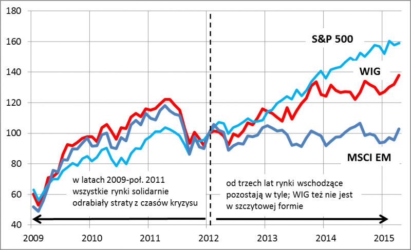 Kondycja emerging markets nie jest obojętna także dla inwestorów na GPW. Nie tylko dlatego, że formalnie polski rynek akcji jest ciągle zaliczany do wschodzących. W praktyce zmiany rodzimego WIG-u są na dłuższą metę pewnym kompromisem między trendami na rynkach rozwiniętych i właśnie wschodzących (prawdopodobnie ze względu na strukturę sektorową naszego indeksu). Ostatnie lata dobitnie pokazują, że pozostające w tyle emerging markets są przysłowiową kulą u nogi dla WIG-u.