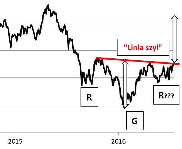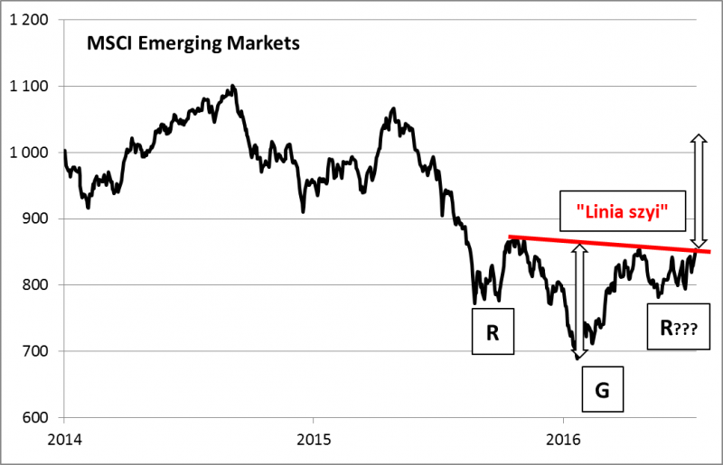 Jeśli spojrzymy na szerszy kontekst, to podtrzymać można koncepcję techniczną, o której pisaliśmy już kilkakrotnie. "Brexit" tylko chwilowo przeszkodził w budowaniu obszernej formacji zwanej enigmatycznie "odwróconą głową z ramionami" (oRGR). Indeks emerging markets jest już na poziomie tzw. linii szyi. Jej przebicie zgodnie z książkowymi schematami mogłoby oznaczać potencjał zwyżkowy szacowany na nawet 25% (!). Oczywiście ciut za wcześnie, by przesądzić o tym, że optymistyczna formacja już w pełni powstała.