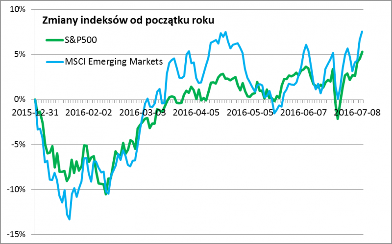 Amerykański S&P500 powrócił do formy, po wielomiesięcznej przerwie sięgając po nowy rekord hossy (i wszechczasów zarazem). Bardzo ważne jest, że towarzyszy temu także wspinaczka indeksu rynków wschodzących, który co prawda o rekordach może pomarzyć (brakuje do nich raptem... jakieś 50%), ale nie tylko dotrzymuje kroku indeksowi Wall Street, lecz wręcz przoduje w zwyżkach. Licząc od początku roku indeks emerging markets jest 7,5% na plusie (do wtorku), zaś amerykański odpowiednik: 5,3% na plusie. Różnice w stopach zwrotu są jeszcze bardziej widoczne, jeśli za punkt wyjścia przyjmiemy dołek styczniowej wyprzedaży (+24% wobec +15%). To ważne, bo przecież w poprzednich latach nie raz zdarzało się, że rynki wschodzące mimo dobrej formy Wall Street nie potrafiły zebrać się w sobie.