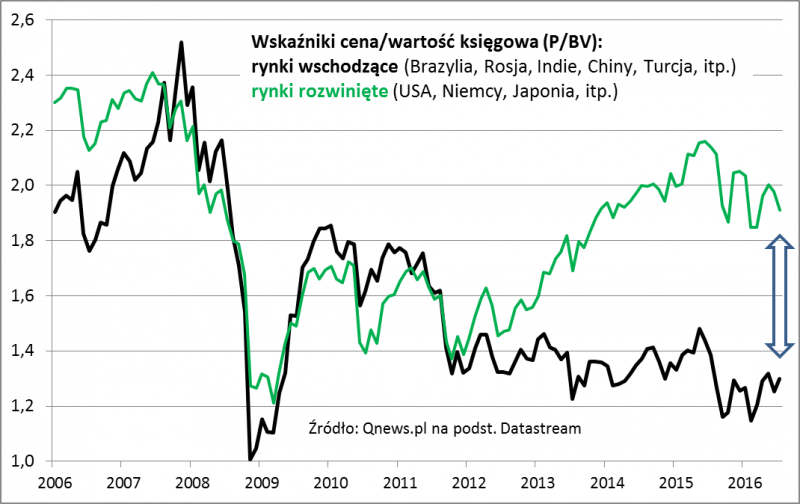Ciekawe jest też to, że nieco lepsza postawa emerging markets w tym roku w porównaniu z rynkami rozwiniętymi oznacza, że rozpoczął się być może proces "konwergencji", jeśli chodzi o wyceny akcji. Innymi słowy, rynki wschodzące po kilku latach bardzo słabych stóp zwrotu są wyraźnie tańsze niż rozwinięte (z USA na czele), szczególnie względem mniej podatnych na cykliczne wahania parametrów finansowych, takich jak wartość księgowa lub przychody ze sprzedaży. Ta luka w wycenach zaczęła się zmniejszać, ale do jej domknięcia jeszcze daleka droga - i właśnie w tym tkwi największa obecnie zaleta emerging markets.