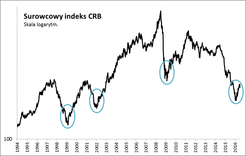 Oczywiście na drodze do realizacji pozytywnego scenariusza mogą stanąć jakieś przeszkody - tak już bywało nie raz w ostatnich latach, kiedy fale nadziei przeplatały się z falami rozczarowania, wywołanymi np. przez niepokojące wieści z Chin oraz spadek cen surowców, z którymi notowania akcji na emerging markets są mocno skorelowane. Być może jednak tym razem sytuacja jest o tyle inna, że indeks cen surowców wykonał już wyraźne odbicie w kształcie litery "V" przypominające podobne zmiany trendu z przeszłości.