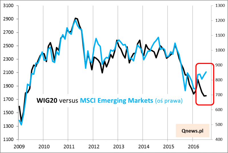 A nasz rynek? WIG20 - historycznie silnie skorelowany z indeksem rynków wschodzących - ciągle pozostaje daleko w tyle. I to nawet mimo dość pochlebnych komentarzy zagranicznych brokerów na temat najnowszej koncepcji zmian w systemie emerytalnym (J.P. Morgan: "Plan wygląda jeszcze bardziej byczo niż początkowo myśleliśmy"). Pewną rolę odgrywa tu zapewne nadal strach przed konsekwencjami "Brexitu". Teoretycznie takie zaległości to jednocześnie duży potencjał na przyszłość, ale trudniej odpowiedzieć na pytanie kiedy pojawi się impuls do jego realizacji oraz czy WIG20 zdąży z nadrabianiem zaległości zanim rynki wschodzące przeżyją mocniejszą korektę.