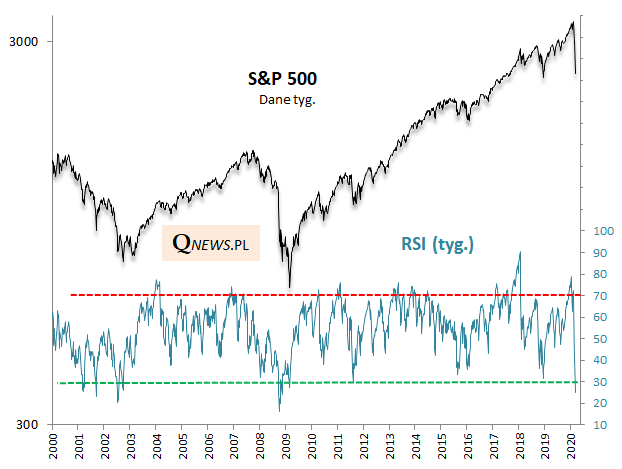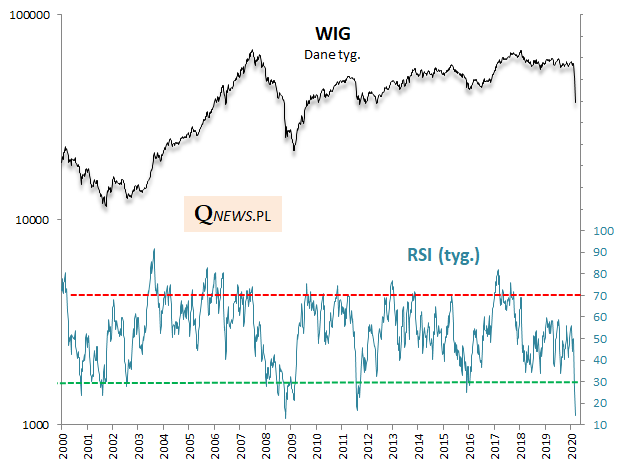 Zacznijmy od GPW. Wg stanu na czwartkowe zamknięcie (z tym zastrzeżeniem, że ostateczny rezultat otrzymamy dopiero po piątkowej sesji) tygodniowy RSI dla WIG-u dosłownie runął w przepaść. Wstępny odczyt RSI to zaledwie ok. 14 pkt. (strefa wyprzedania zaczyna się na pułapie 30 pkt.). Na przestrzeni ostatnich dwudziestu lat z czymś takim mieliśmy do czynienia tylko jeden raz - w październiku 2008 roku.