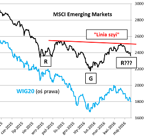 Jak widać ciągle jesteśmy na etapie potencjalnego formowania się drugiego "ramienia" ("R" na wykresie; "G" = "głowa"). Warunek jest taki, by to ramię nie okazało się zbyt długie (czyli by korekta nie sprowadziła indeksu poniżej "G"), bo wówczas cała koncepcja legnie w gruzach. Jeśli jednak korekta w którymś momencie zatrzyma się, a potem dojdzie do mocnego odreagowania, pomysł będzie miał nadal szanse na realizację. Ostatecznym przypieczętowaniem byłoby przebicie "linii szyi". Czy koncepcja sprawdzi się? Trudno przesądzić, ale widać jednocześnie, że scenariusz przeciwny, pesymistyczny - czyli kontynuacja bessy na rynkach wschodzących - wcale nie jest taki oczywisty.