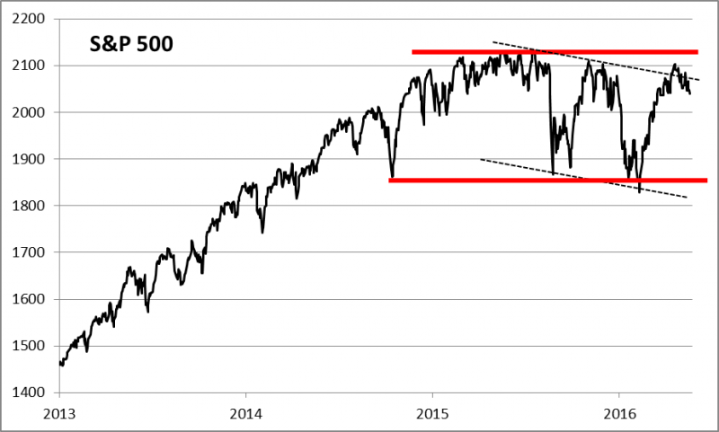 Pierwotnie szacowaliśmy, że WIG może dotrzeć do okolic 45.000 pkt. (na podstawie szerokości tzw. konsolidacji poprzedzającej ostatnie spadki - czyli prostokąta widocznego na wykresie). W którymś momencie mogło się wydawać, że korekta już się kończy, ale ostatnie dni szybko rozwiały te nadzieje. Powracając zatem do pierwotnego scenariusza wydaje się, że osiągnięcie pułapu 45.000 pkt. jest nadal realne. Dobra wiadomość jest jednak taka, że teraz do tego poziomu jest już dużo, dużo bliżej (zaledwie -1,6% po czwartkowej sesji). Czyżby zatem korekta stopniowo wyczerpywała swój potencjał? Oczywiście wiele zależy tu nie tylko od czynników krajowych (obawy odnośnie działań polityków powracają ciągle niczym bumerang), ale też od losów korekty na Wall Street. Wykres S&P500 przynajmniej na pierwszy rzut oka zdaje się sugerować, że za oceanem jest jeszcze sporo miejsca na ewentualną kontynuację korekty spadkowej.