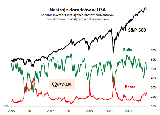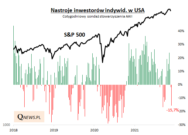 Ostatnia nerwowość na rynkach akcji nie pozostaje bez wpływu na obserwowane przez nas wskaźniki nastrojów ("sentymentu"). Na krajowym rynku uwagę zwraca choćby spadek Indeksu Nastrojów Inwestorów (INI) Stowarzyszenia Inwestorów Indywidualnych do poziomu najniższego od roku. Z jednej strony niewiele brakuje już do dołków z listopada i marca 2020, czyli punktów kulminacyjnych paniki związanej z kolejnymi falami pandemii - to dobra wiadomość. Z drugiej strony w trakcie długotrwałej bessy rozpoczętej na GPW w 2018 roku INI potrafił zejść jeszcze dużo głębiej, a i tak nie zwiastowało to rychłej poprawy koniunktury.