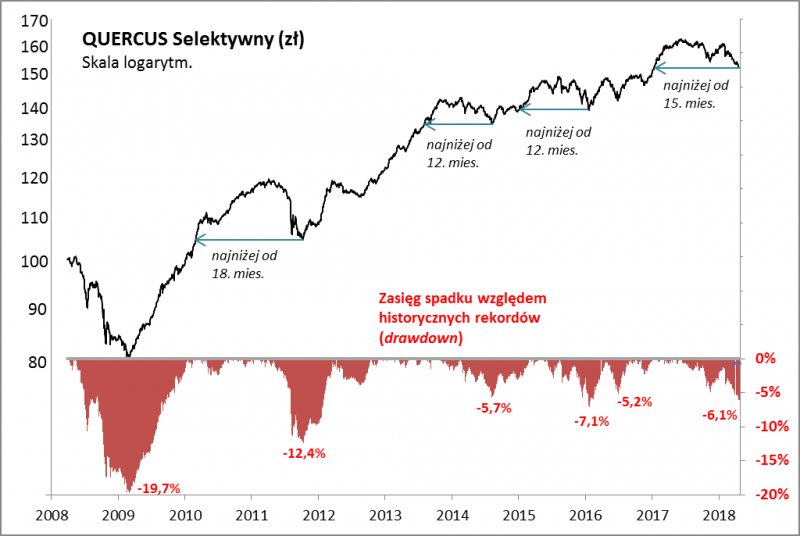 Niedawno pod lupę braliśmy tzw. obsunięcie notowań QUERCUS Agresywnego. Tym razem pod tym samym kątem spójrzmy na inny fundusz o równie długiej historii (sięgającej marca 2008 r.), ale o innym profilu ryzyka/zmienności - QUERCUS Selektywny (obok akcji w portfelu znajdują się również instrumenty dłużne i mniejsza lub większa pozycja zabezpieczająca w kontraktach na WIG20).