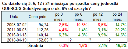 Kupno jednostki po ostatniej przecenie oczywiście jak widać nie gwarantuje, że taniej już nie będzie. Niemniej warto zwrócić uwagę, że nawet w katastrofalnym roku 2008 kupno (w lipcu) zaowocowało kilkunastoprocentową dodatnią stopą zwrotu w horyzoncie 24-miesięcznym, i to mimo faktu, że w ciągu pierwszych sześciu miesięcy jednostka potaniała jeszcze o ponad 10%. Z kolei w pozostałych dwóch przypadkach dodatnie stopy zwrotu pojawiły się już w horyzoncie półrocznym.