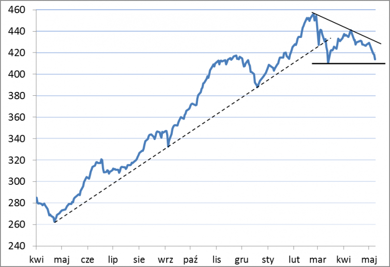 Zdecydowanie lepiej wygląda wykres obliczanego przez nas indeksu nieważonego (obejmuje wszystkie spółki z GPW), ale i tu pojawia się groźba przełamania ważnego poziomu wsparcia. Gdyby tak się stało, należałoby uznać, że trend po raz pierwszy od wielu miesięcy zmienia się na spadkowy. Warto podkreślić, że w odróżnieniu od korekt z minionego roku, tym razem mamy do czynienia z rozbudowanym układem na wykresie. Najbliższe dni mogą tu mieć kluczowe znaczenie.