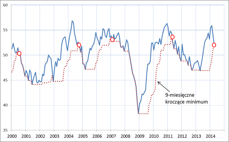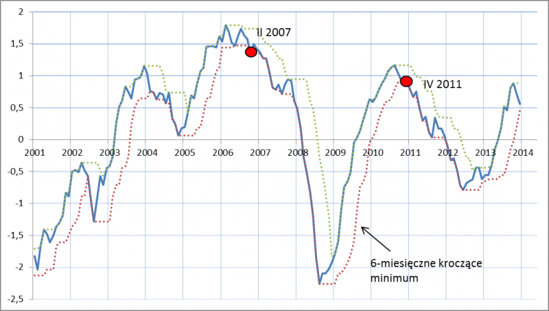 Oczywiście sytuacja w przemyśle to nie wszystko, dlatego spoglądamy też na obliczany przez nas Zagregowany Indeks Koniunktury (obok PMI obejmuje on także dwa inne wyselekcjonowane przez nas wskaźniki: obrazujący koniunkturę w sektorze bankowym indeks Pengab oraz wskaźnik nastrojów niemieckich przedsiębiorców instytutu Ifo). W kwietniu ZIK także spadł, ale jeszcze nie na tyle, by pojawił się umowny sygnał końca trendu wzrostowego, jakim był w przeszłości spadek do półrocznego minimum.