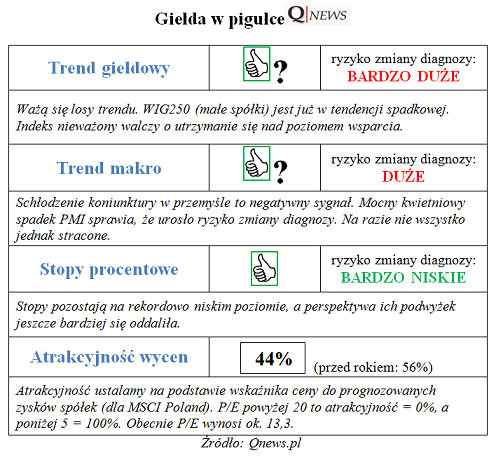Pęknięte poziomy wsparcia na wykresie indeksu małych spółek i schłodzenie koniunktury w przemyśle z jednej strony. A z drugiej – jeszcze większe szanse na utrzymanie stóp procentowych na rekordowo niskim pułapie i zachęcający niski poziom optymizmu rynkowego. Tak wygląda obraz sytuacji na GPW.