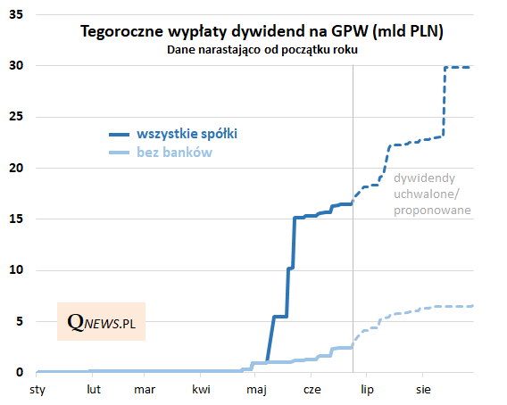 Na tym jeszcze nie koniec, bo sezon dywidendowy będzie obejmował również nadchodzące miesiące letnie. Szacujemy, na podstawie uchwał, jak i propozycji spółek, że do końca sierpnia łączna kwota tegorocznych dywidend zbliży się do 30 mld zł (a udział sektora bankowego w wypłatach dla akcjonariuszy nieco zmaleje - poniżej 80 proc.). Potem sezon będzie kontynuowany jeszcze co najmniej we wrześniu.