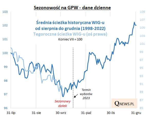 Oczywiście jeszcze raz podkreślmy, że przedstawiona ścieżka oparta jest na średniej historycznej, od której zdarzały się zarówno pozytywne, jak i mocno negatywne odchylenia (najbardziej spektakularne - w roku 2008, po upadku Lehman Brothers). W tym roku dodatkowe czynniki, mogące zaburzyć ścieżkę sezonową (oczywiście oprócz wydarzeń na rynkach globalnych), to dzisiejsze posiedzenie RPP, a później, 15 października, wybory parlamentarne.