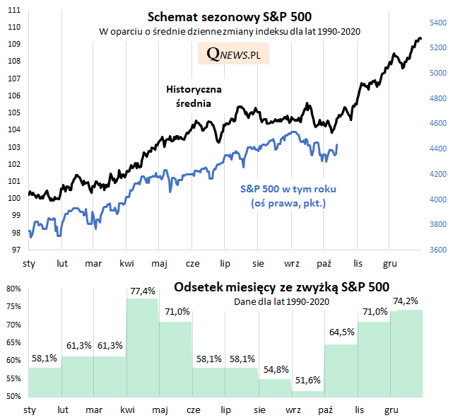 Reasumując, sezonowość giełdowa, która nie sprzyjała amerykańskim akcjom począwszy od sierpnia, teraz dla odmiany staje się korzystnym czynnikiem.